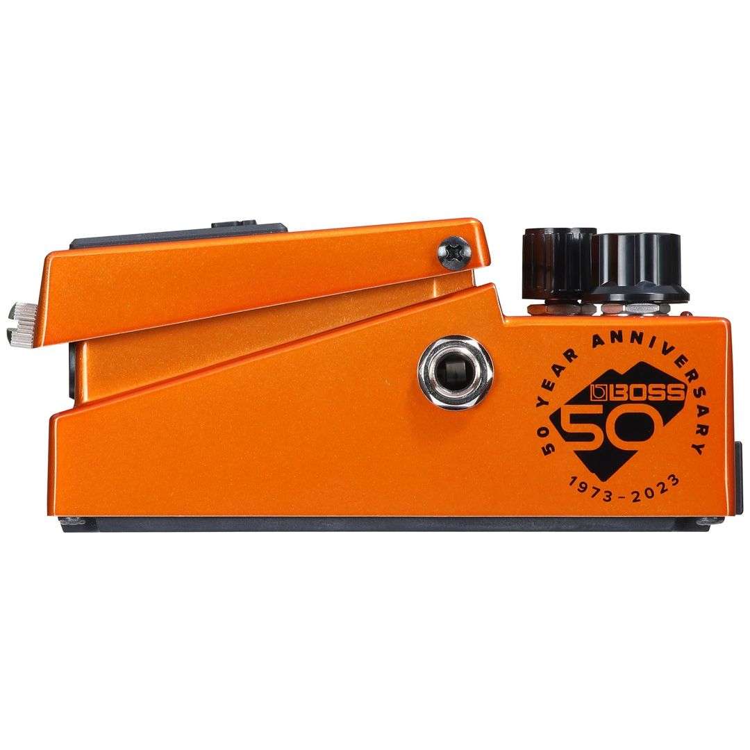 Il pedale presenta una finitura metallica, una vite ad alette argentata, pomelli ricoperti d’oro e un emblema commemorativo del 50° anniversario, rendendolo visivamente distintivo.
