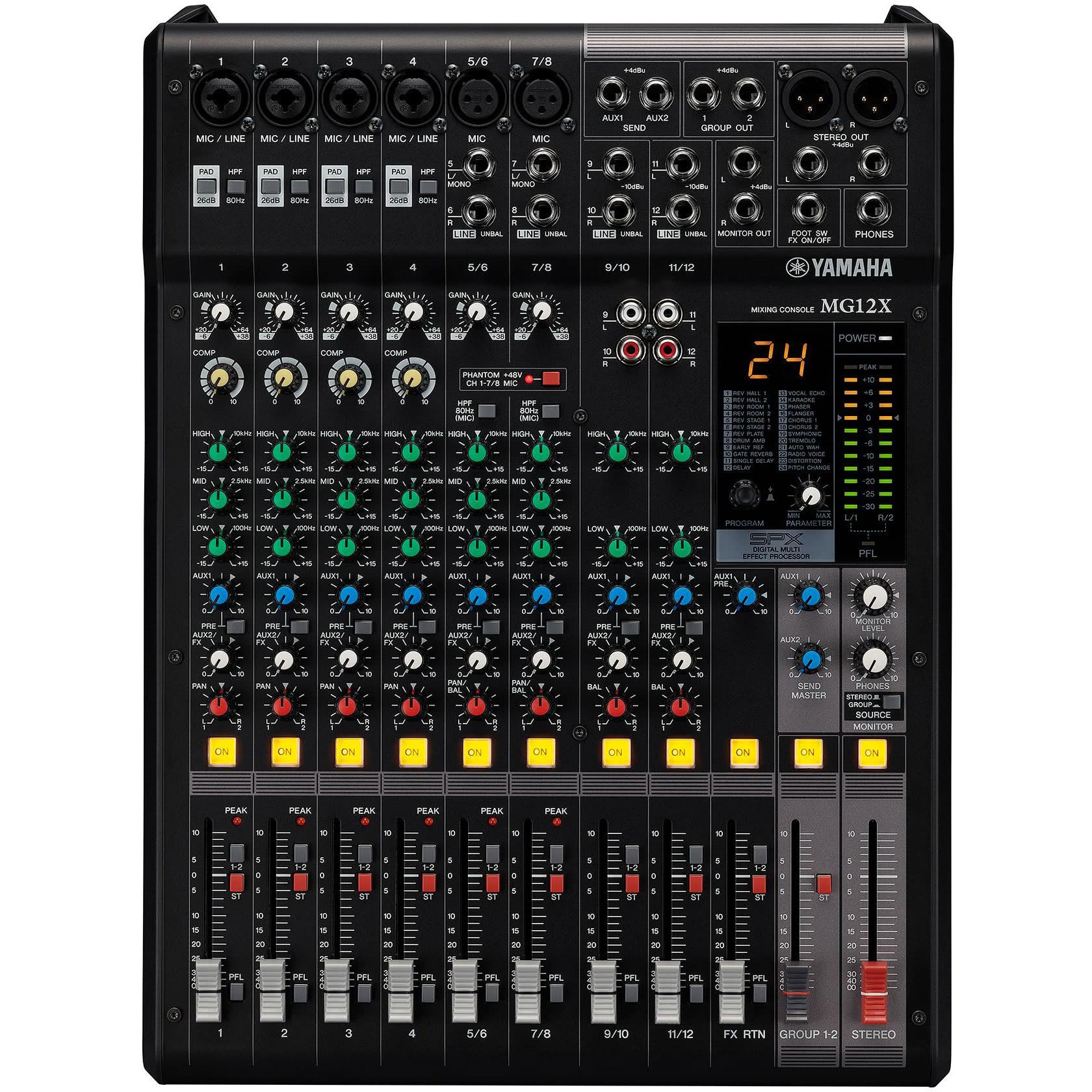 Il Yamaha MG12X integra il celebre processore SPX con 24 programmi di effetti digitali, tra cui riverberi, delay, chorus e modulazioni. Questi effetti migliorano la resa sonora delle performance live e delle registrazioni senza la necessità di unità esterne.